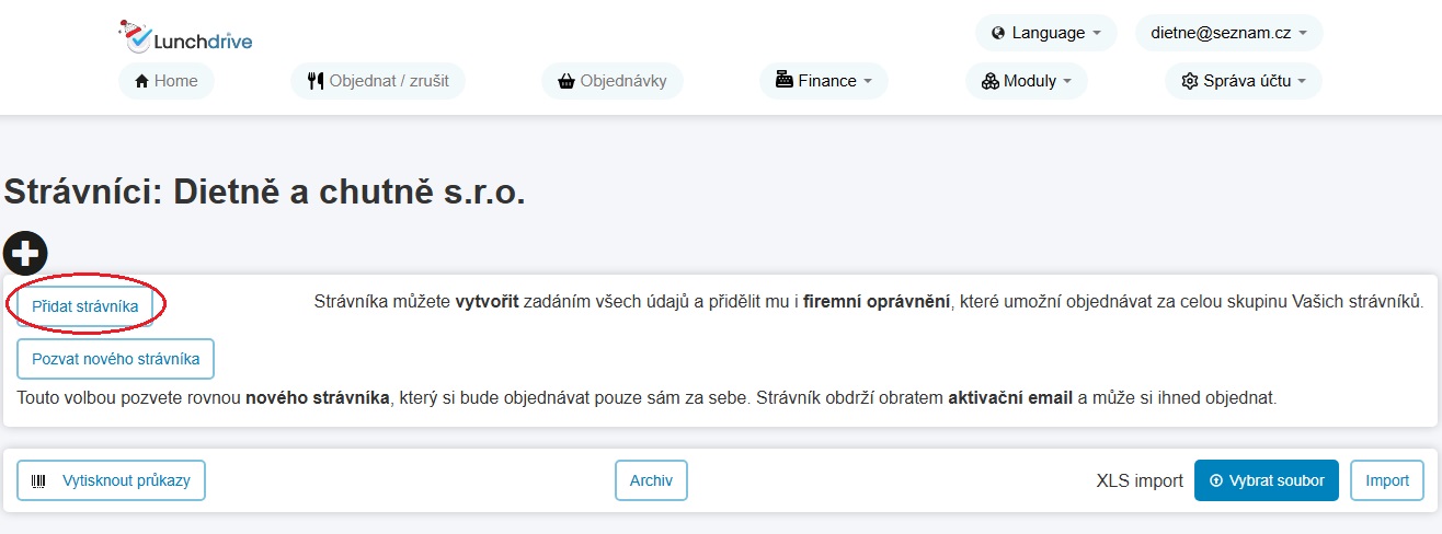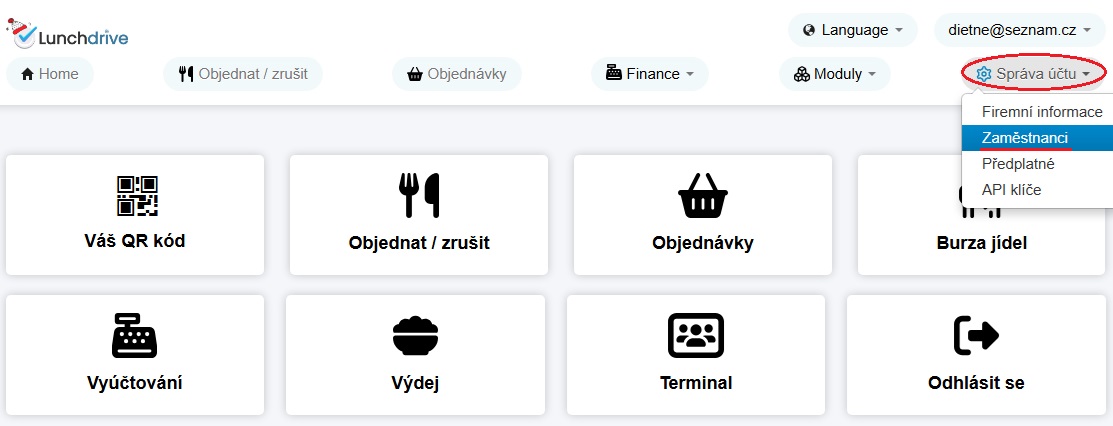 Pokud zvolíte roli správce, bude mít oprávněná osoba možnost provádět hromadné objednávky a přidávat další zaměstnance. Běžný uživatel (strávník) si může jen objednávat jídla.