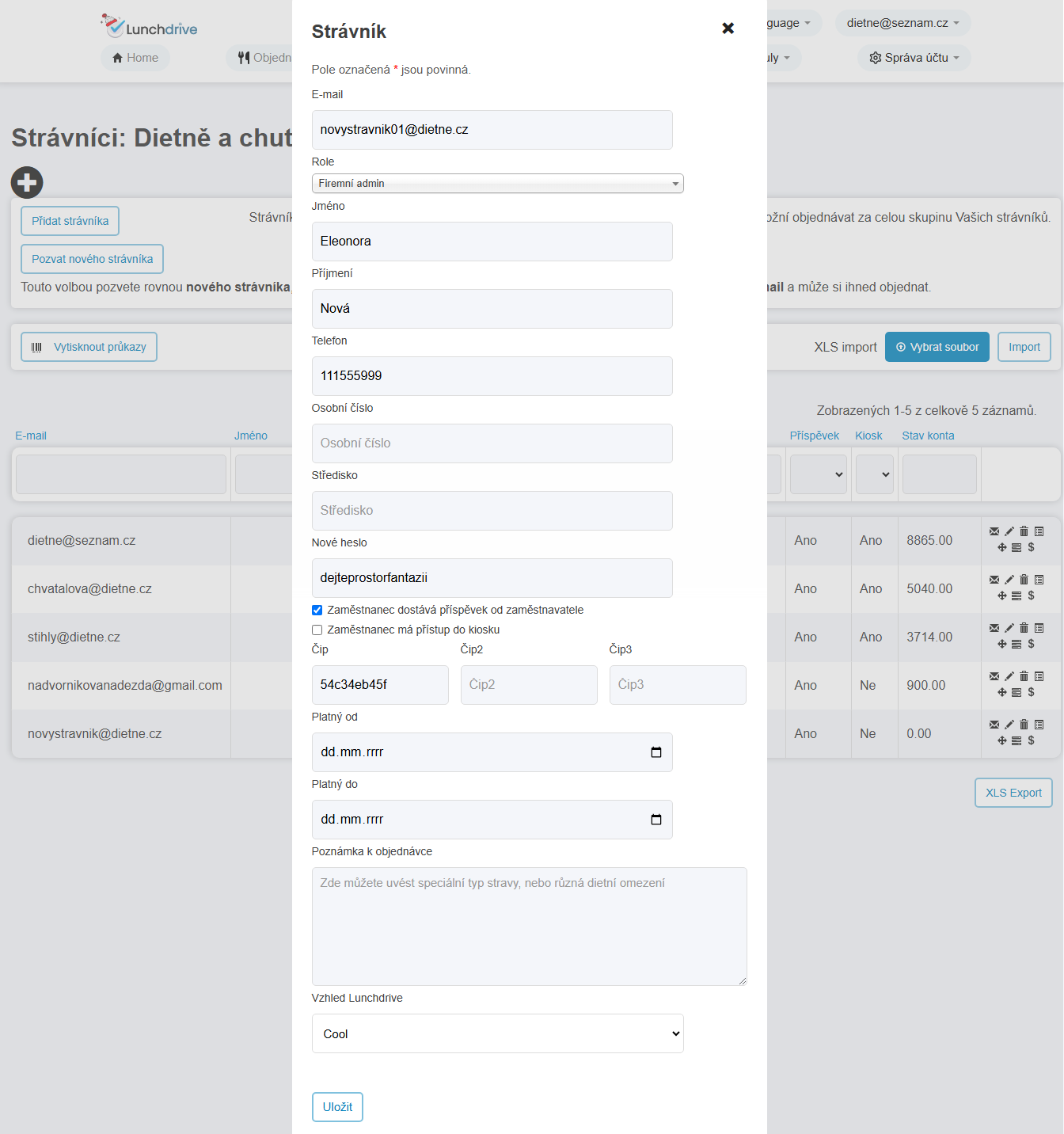 Tip: Pokud máte zaměstnance, kteří nemají emaily, můžete vyplnit jakýkoliv email a nastavit heslo. Tito zaměstnanci si pak musí pouze pamatovat tyto údaje, aby si v systému mohli jídla objednávat.