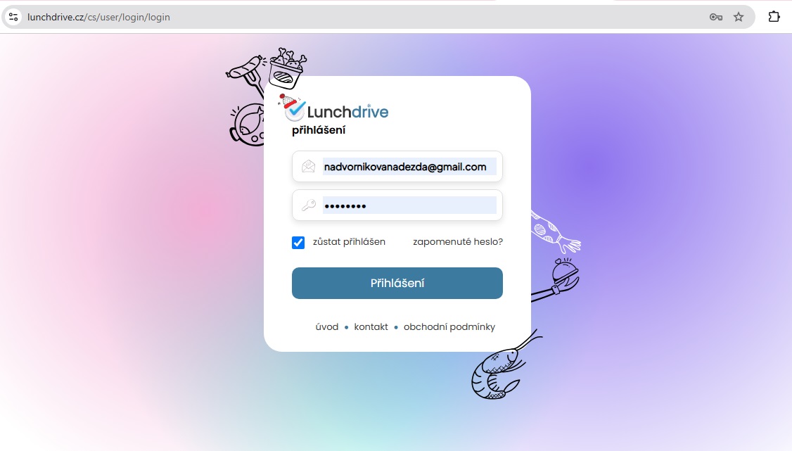 Do systému se mohou přihlašovat pouze zaregistrovaní strávníci a to pomocí jakéhokoliv zařízení s připojením na internet (telefon, mobil či počítač) přes tento odkaz: https://lunchdrive.cz/cs/user/login/login
