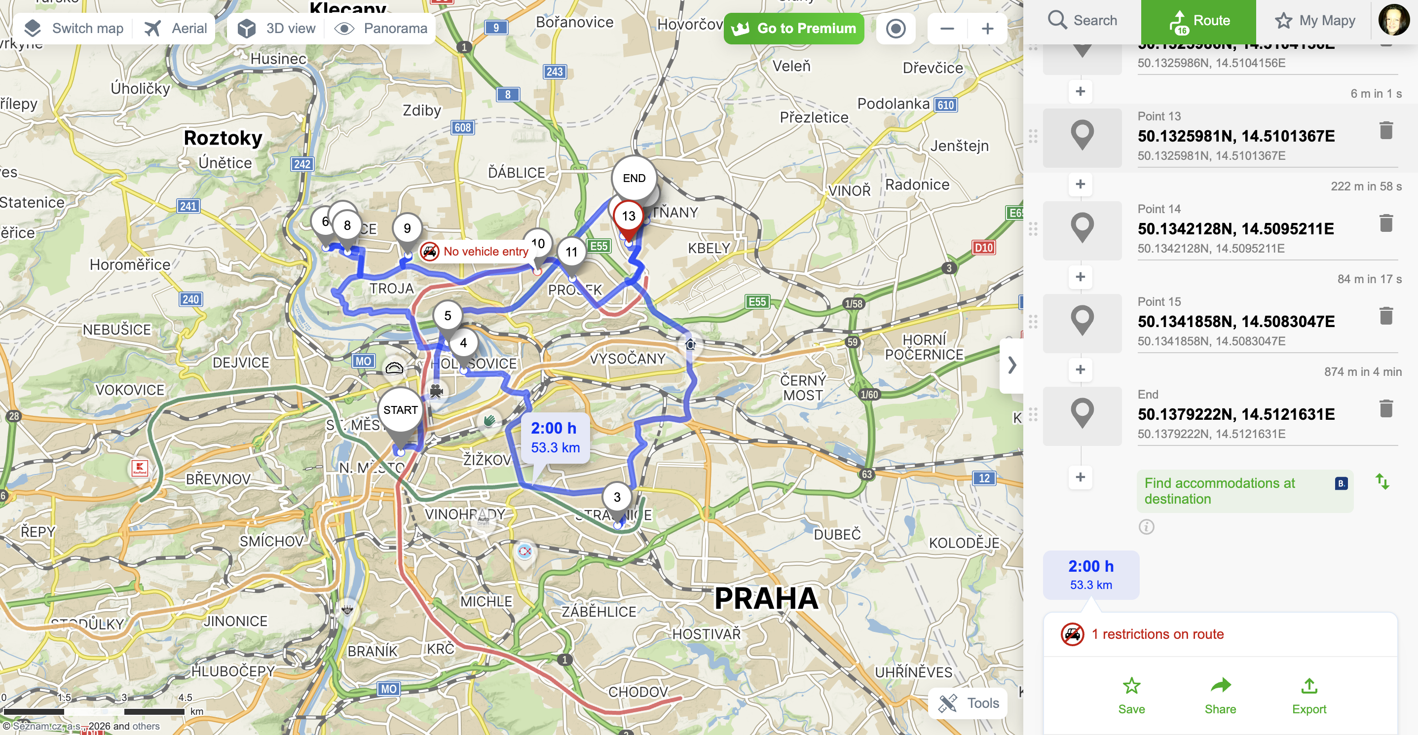 4. Každá trasa má možnost exportu do seznam map, kde se prvních 15 průjezdních bodů vyexportuje a řidič se může podle nich navigovat.
