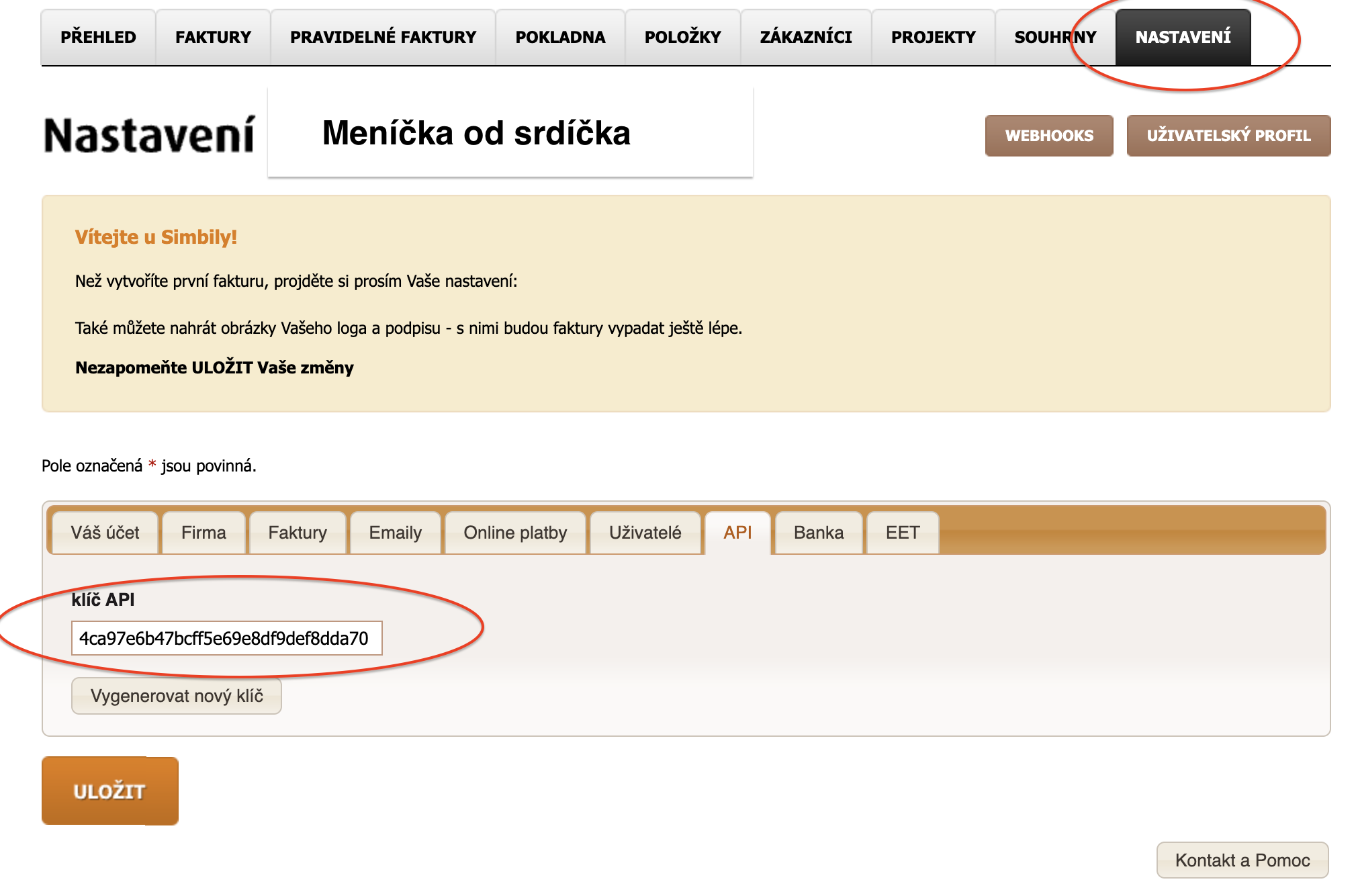 Vložte zkopírovaný API klíč a přihlašovací email, který jste použili v Simbila do účtu Lunchdrive