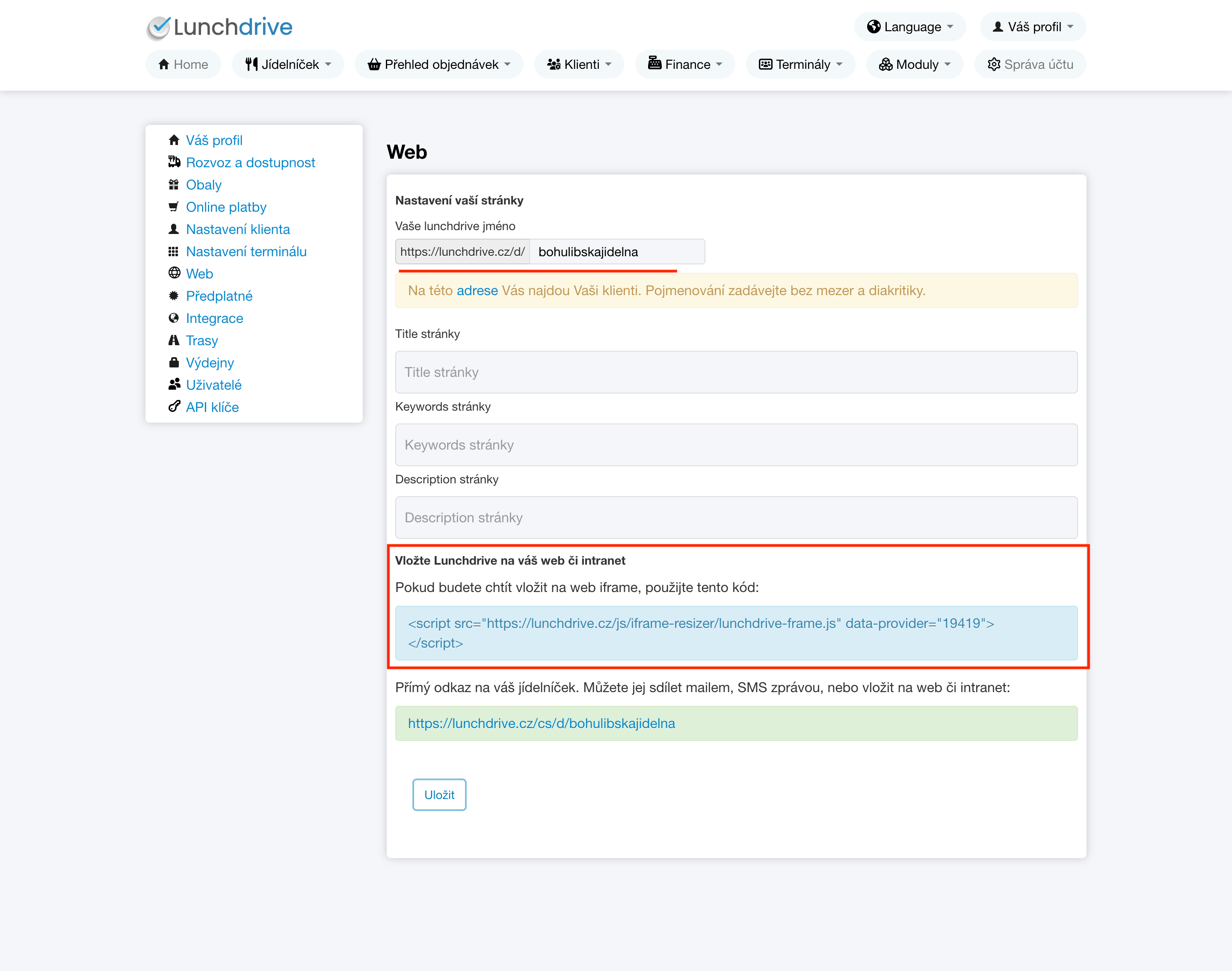 Ve Správě účtu / Web si můžete nadefinovat vlastní adresu na Lunchdrive, nastavit titulek a popis stránky pro vyhledávače a sdílení na sítích k vašemu veřejnému profilu. Vlastní adresa pomůže pro lepší orientaci Vašich klientů a usnadní Vám prezentaci na sociálních sítích, v případě, že nemáte vlastní web.