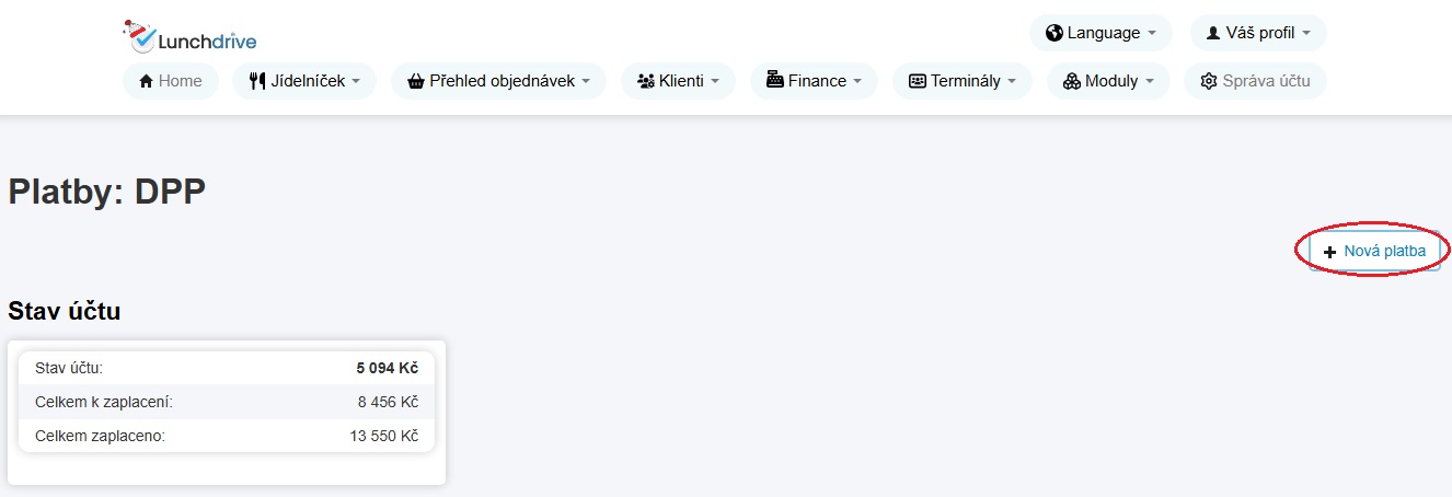 Teď klikněte na pravé straně na Nová platba.