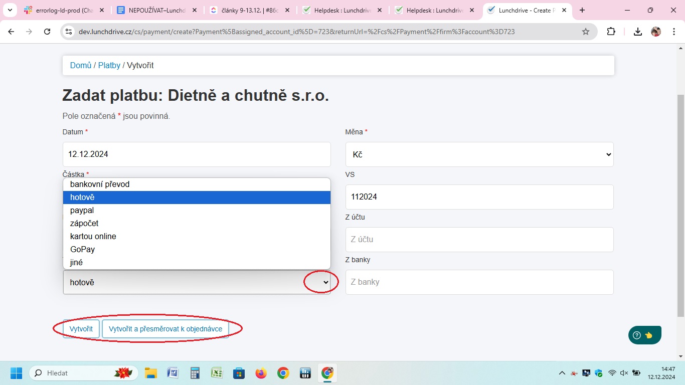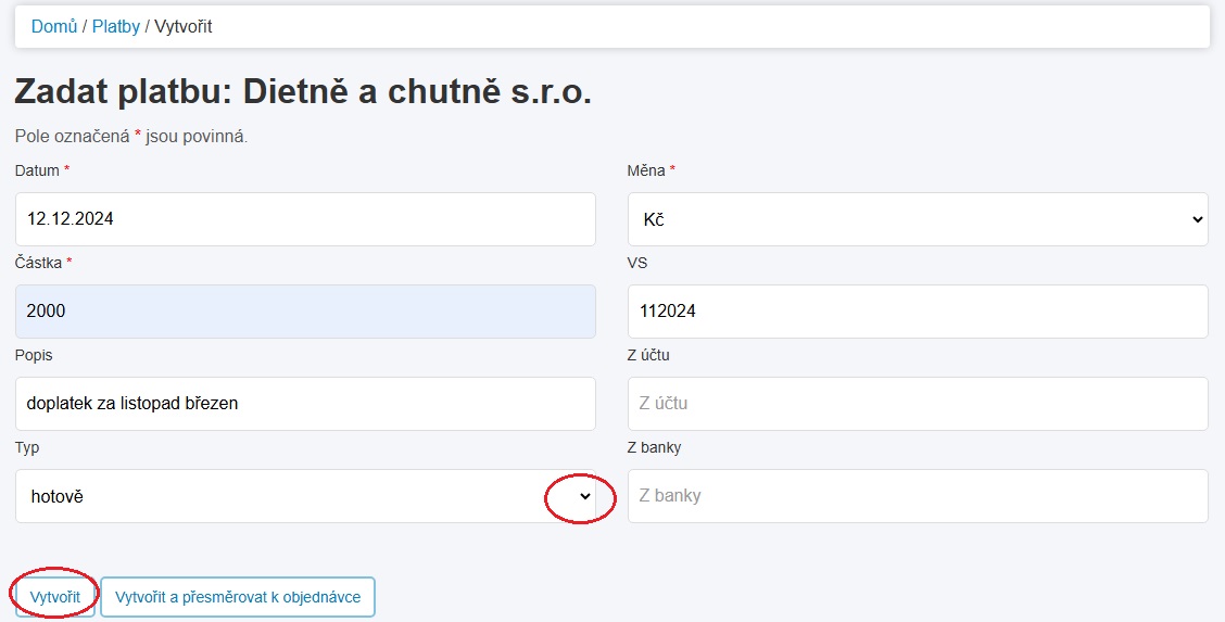 Po vyplnění nutných kolonek platbu uložte. Máte na výběr "jen" Vytvořit (platbu) a automaticky přejít na přehled plateb, nebo Vytvořit platbu a přejít k tvorbě objednávky. Z nabízených možností vyberte tu, kterou momentálně potřebujete.