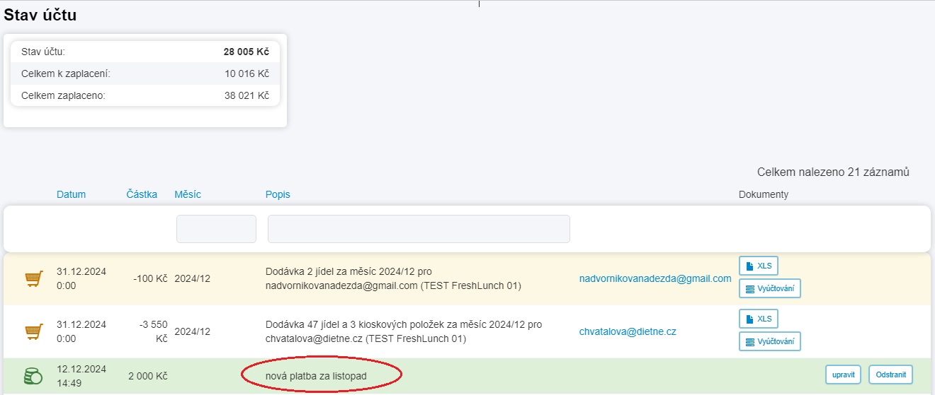 Pokud zvolíte "jen" Vytvoření platby, automaticky se dostanete na přehled, kde vidíte všechny doposud vytvořené platby.
