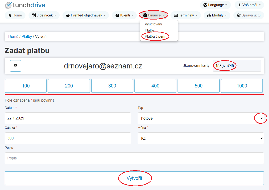 Jděte v menu do sekce Finance a klikněte na Platba čipem. Následně načtěte čip strávníka, zvolte částku, způsob úhrady a vytvořte platbu. Hotovo :). Platba se připíše na účet firmy, ke které strávník patří.
