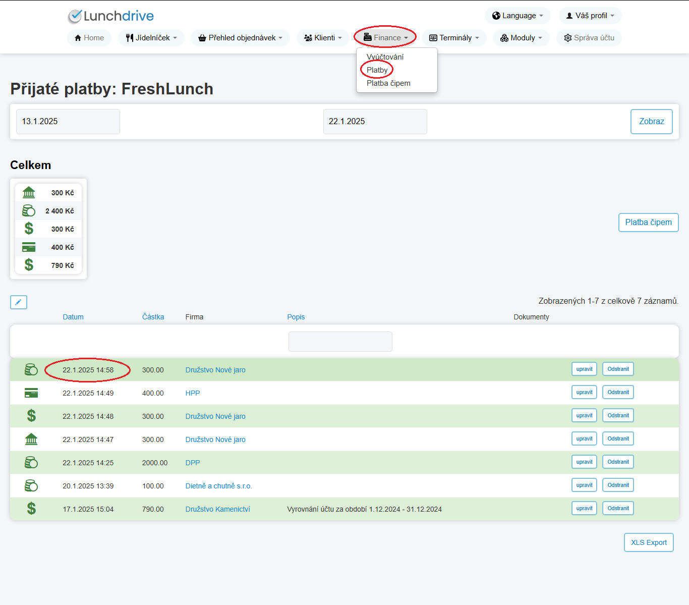 V sekci Finance / Platby pak všechny přijaté platby vidíte.