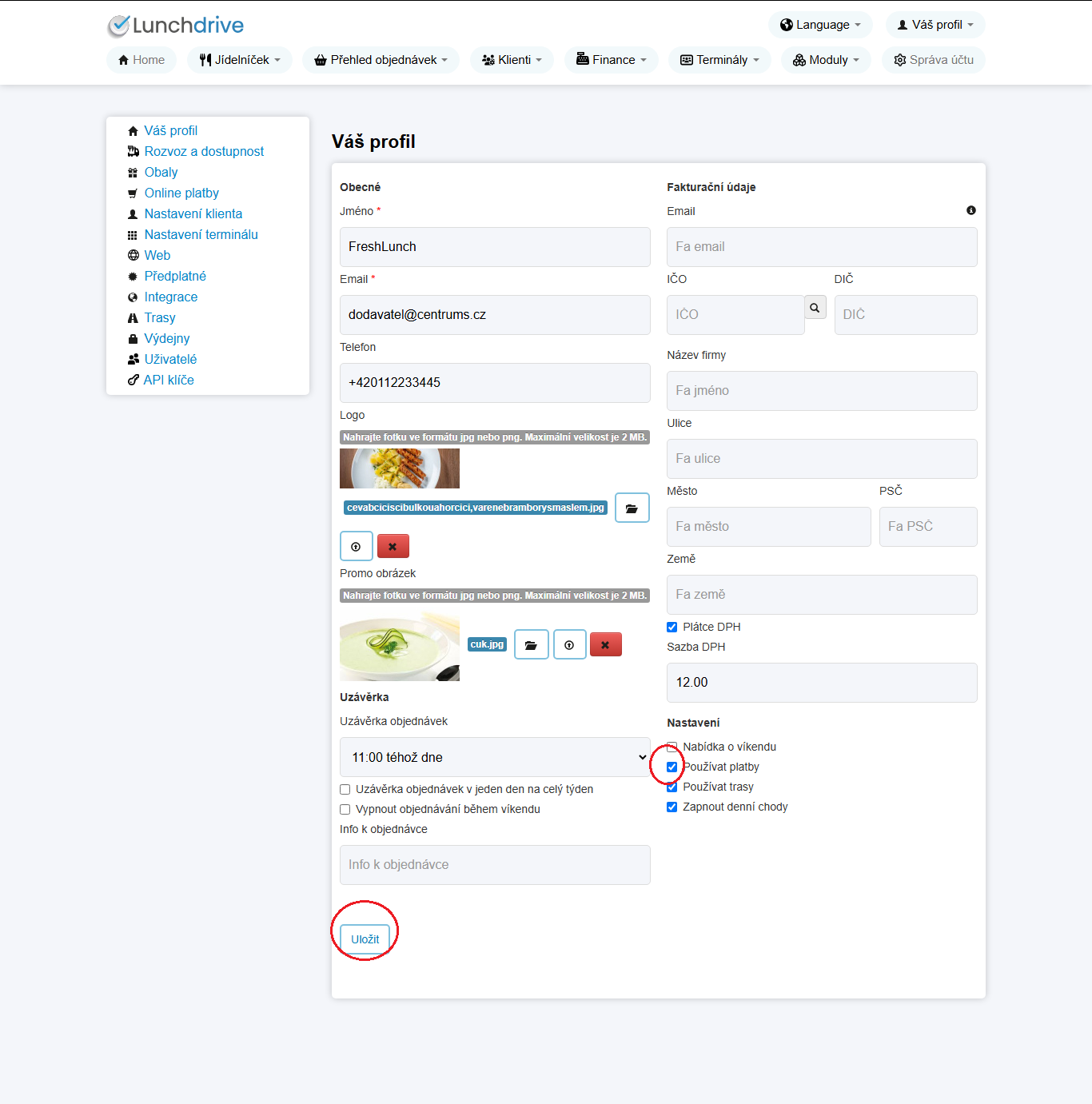 Nastavení pro platbu kartou proveďte zakliknutím Používat platby ve Správa účtu. Umožníte tak klientům platbu kartou za svou objednávku. Zkontrolujte nastavení klienta dle návodu zde