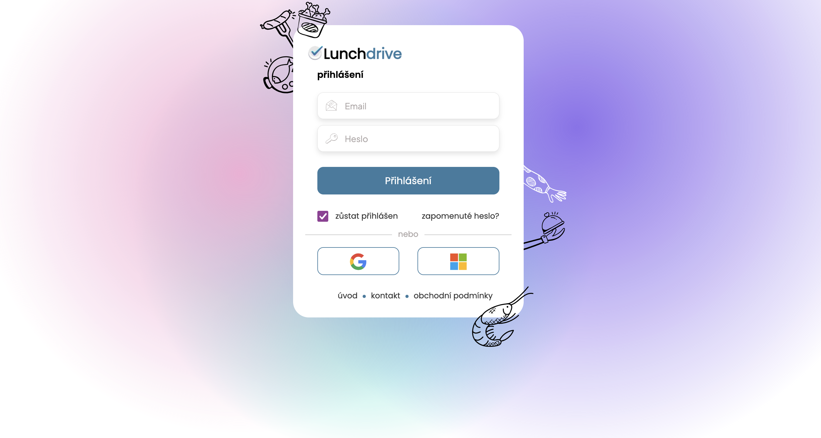 Lunchdrive umožňuje přihlašování zavedených uživatelů pomocí SSO přihlášení pomocí google či microsoft platformy.