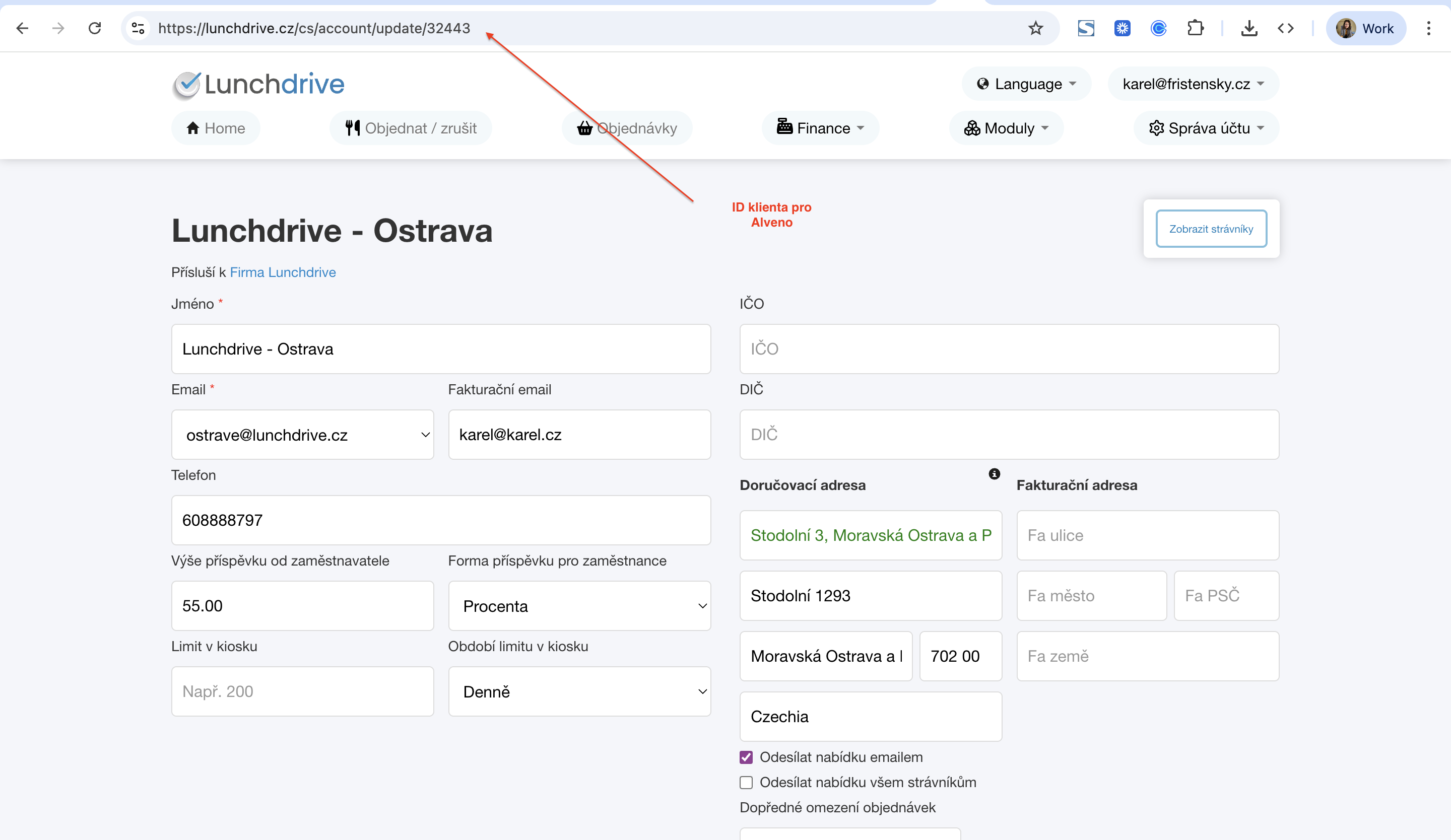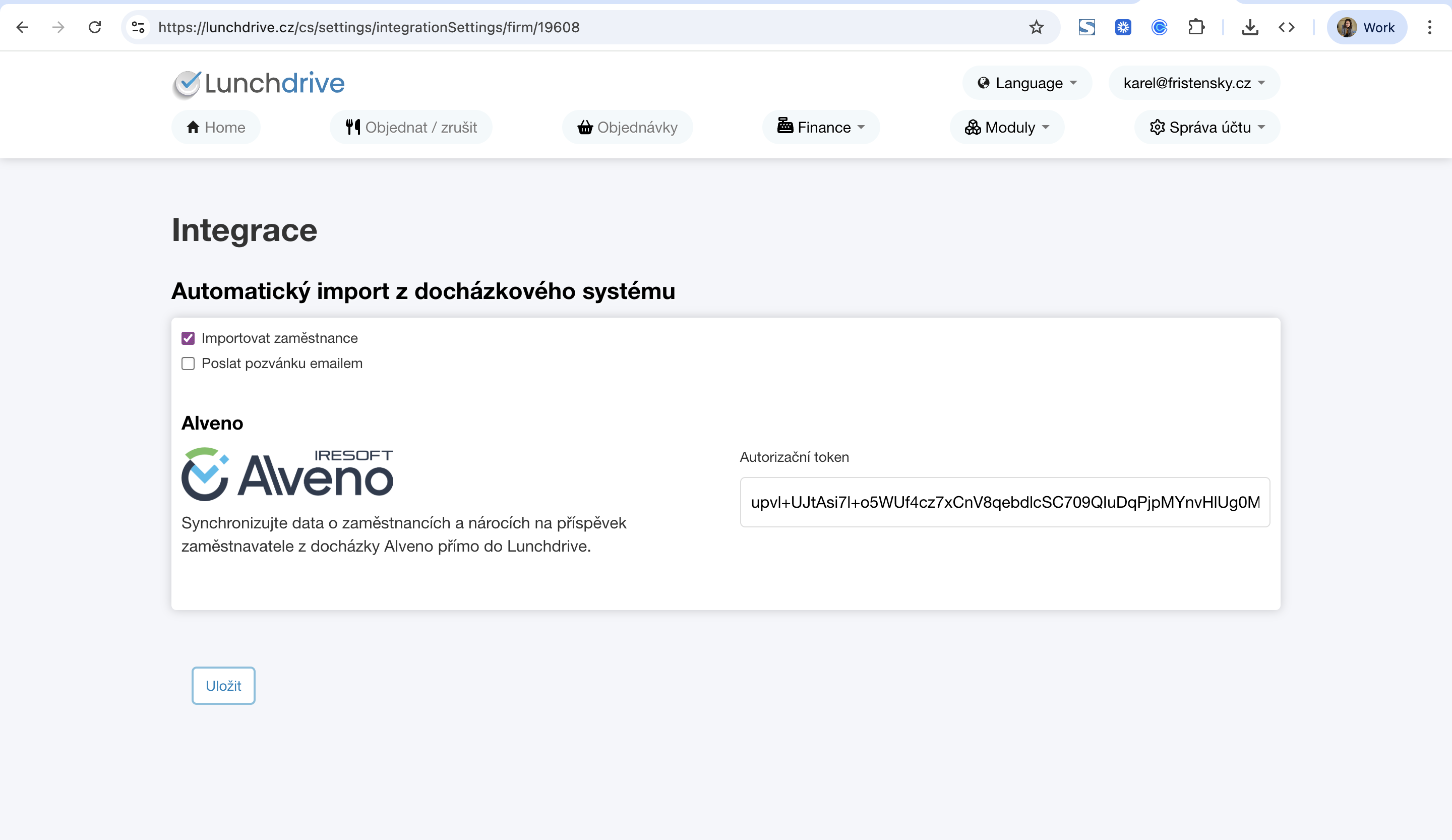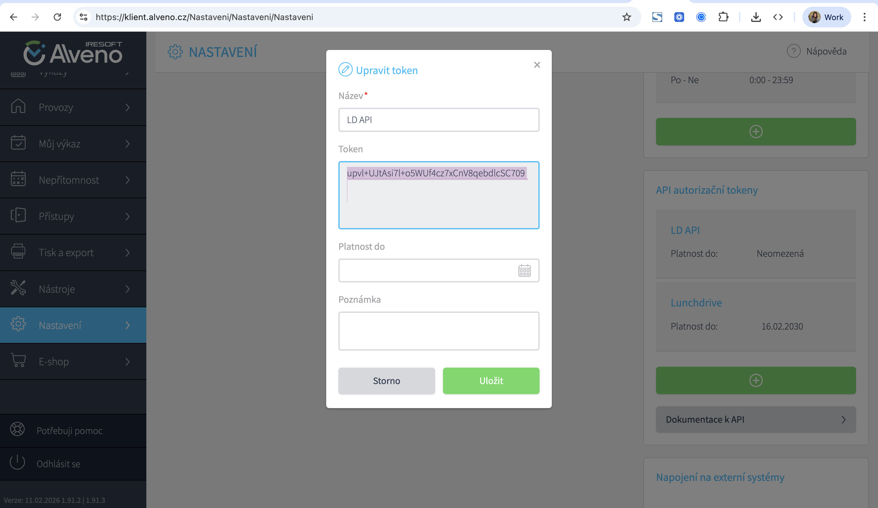 V alvenu vygenerujte v sekci nastavení nový TOKEN pro komunikaci s Lunchdrive: https://klient.alveno.cz/Nastaveni/Nastaveni/Nastaveni