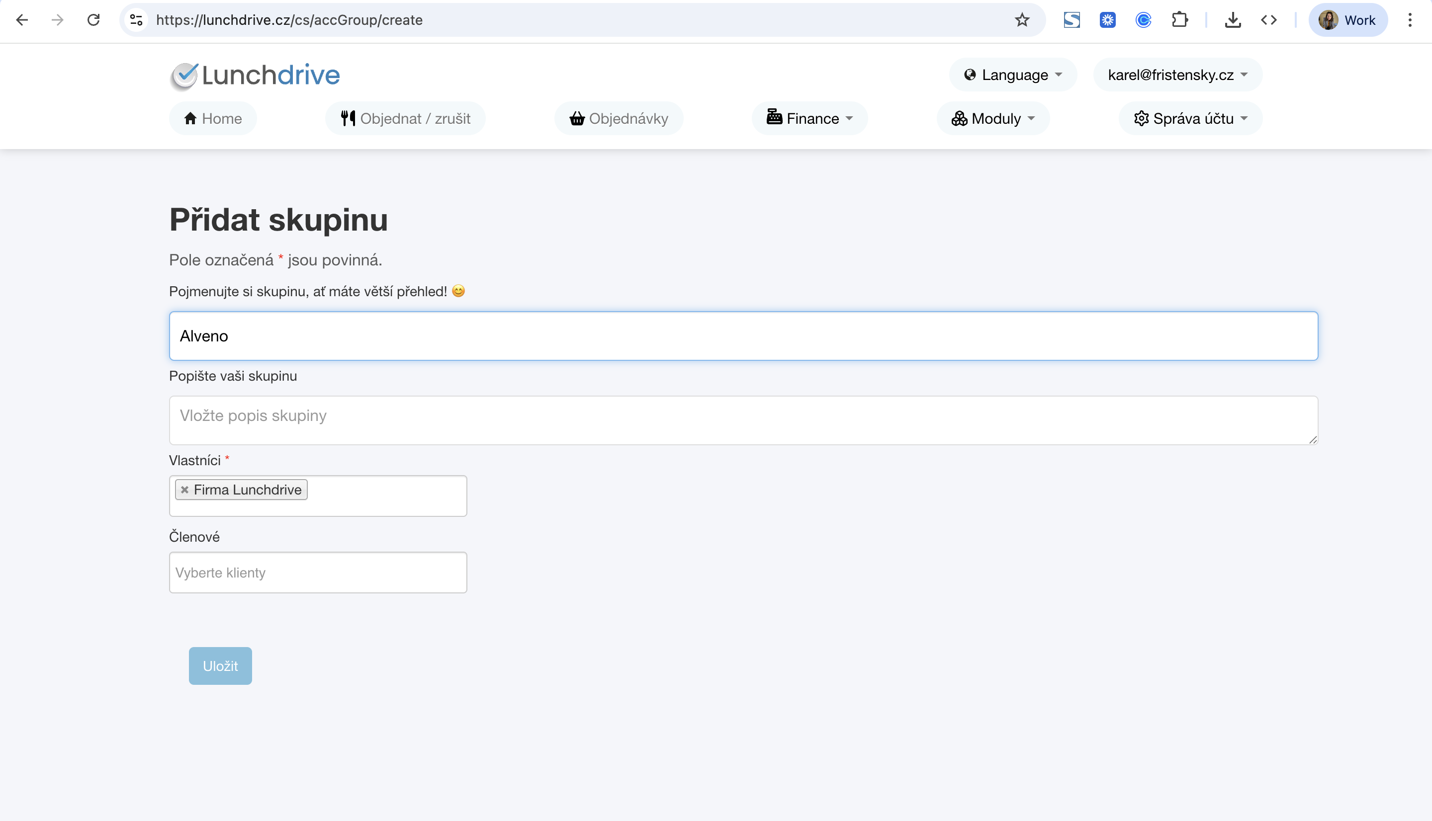 Ve firemním účtu v nabídce skupiny vytvořte skupinu. např. Alveno či název vaší firmy. https://lunchdrive.cz/cs/accOwner/ownedFirms