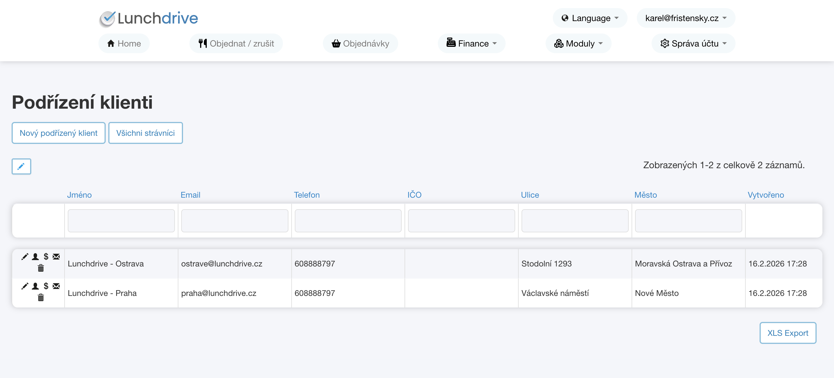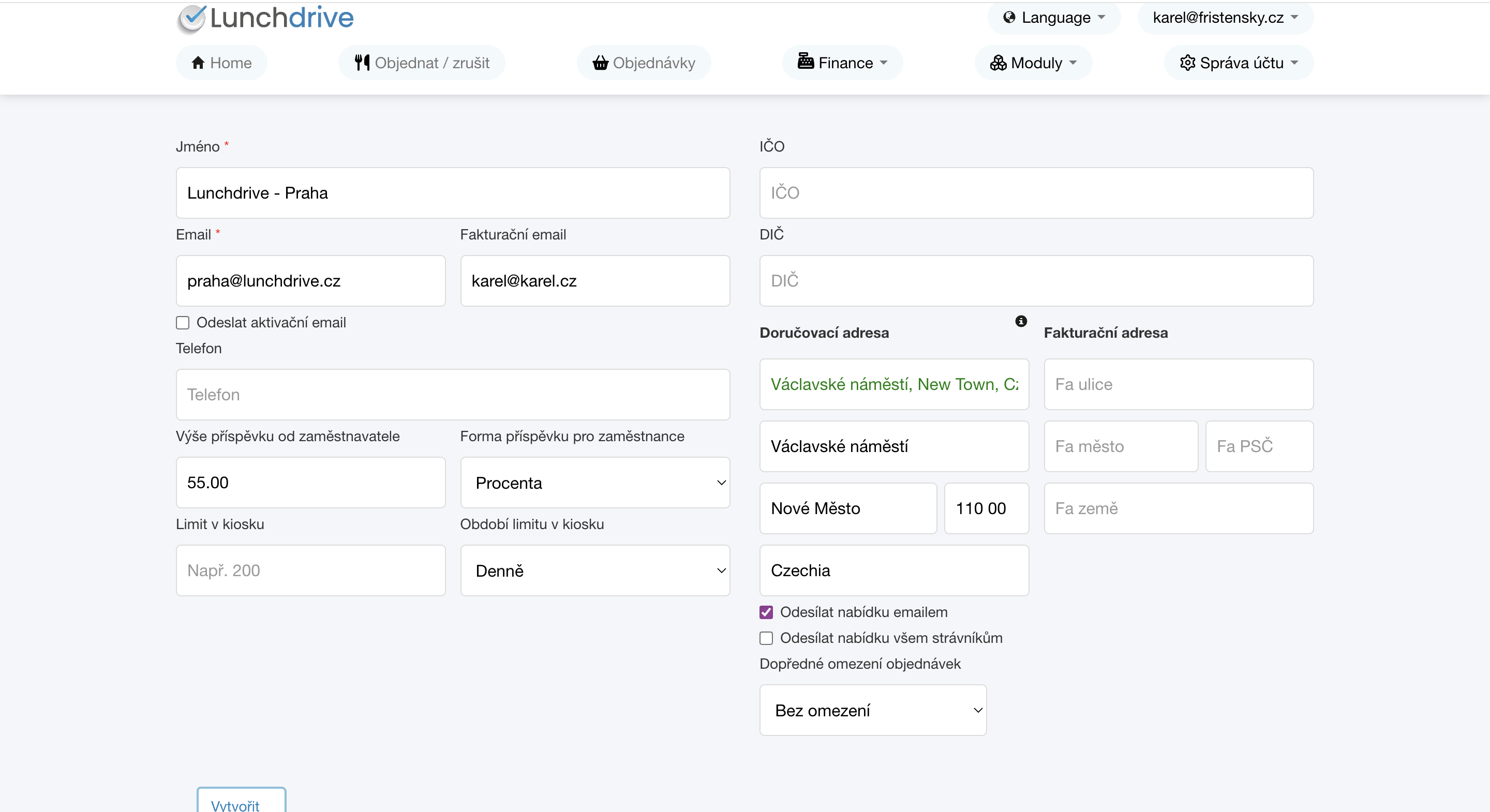 V Lunchdrive si nejdříve pod přístupem hlavního správce vytvořte klienta s jednotlivými parametry. Přihlaste se jako firemní administrátor tohoto klienta.