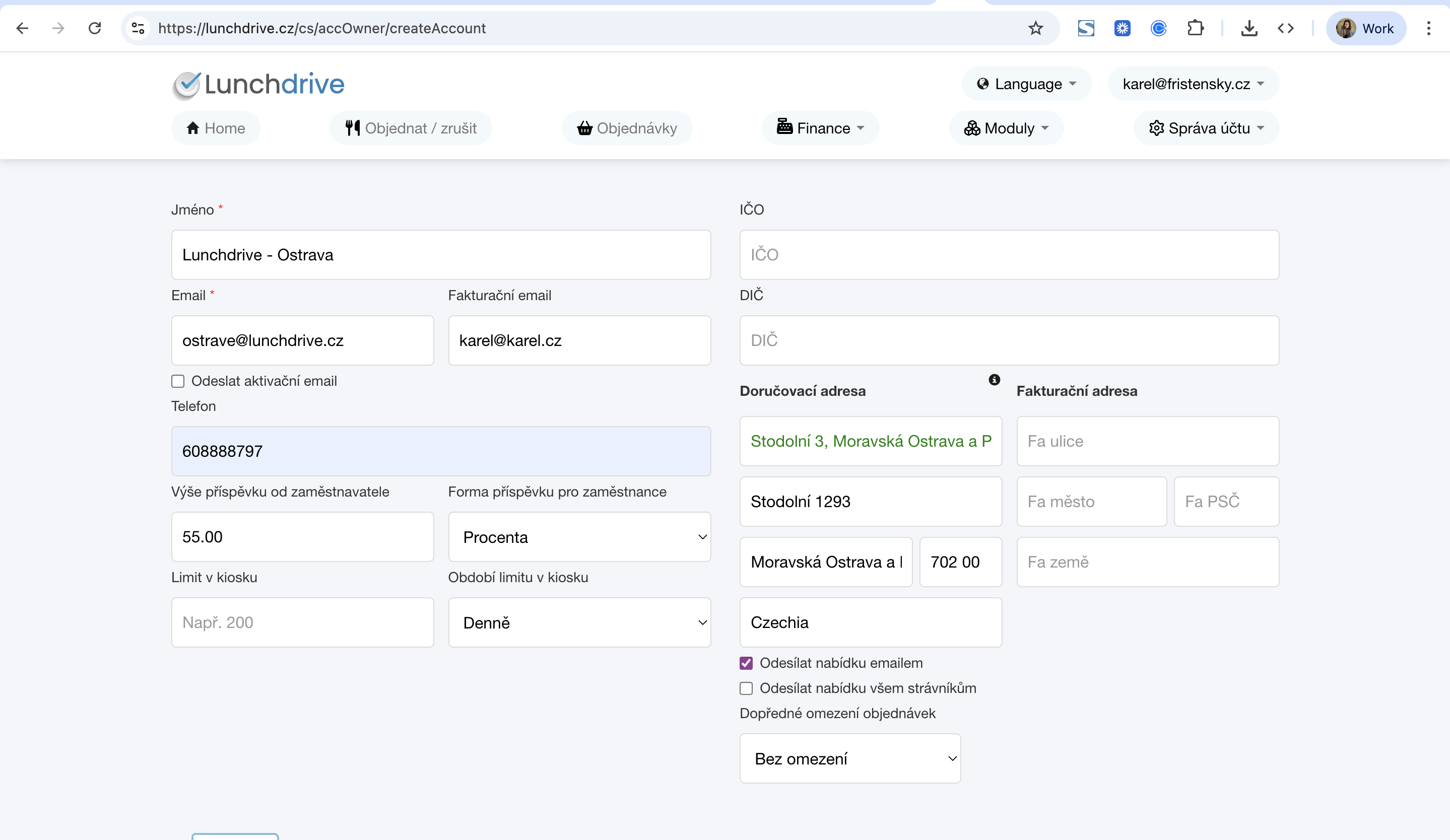 Poté si vytvořte do příslušné skupiny další podřízené klienty, do kterých se budou zaměstnanci synchronizovat, např. pro provozy v Praze či Ostravě. https://lunchdrive.cz/cs/accOwner/createAccount