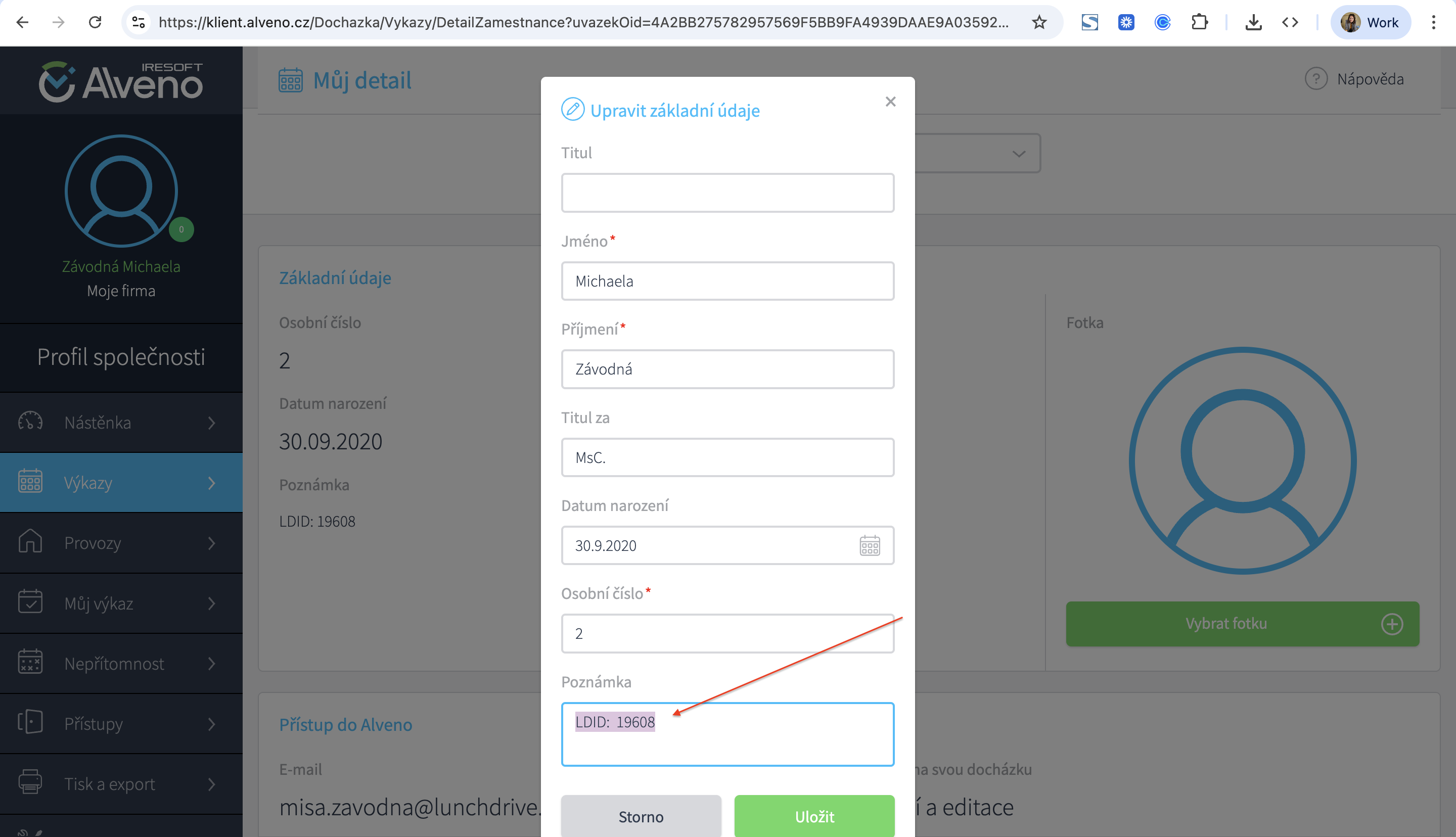Poté do docházky Alveno ke každému zaměstnanci zadejte v části poznámka číselné označení ID daných klientů. V tomto povinném formátu: LDID: 32567(číselné označení podřízených klientů)